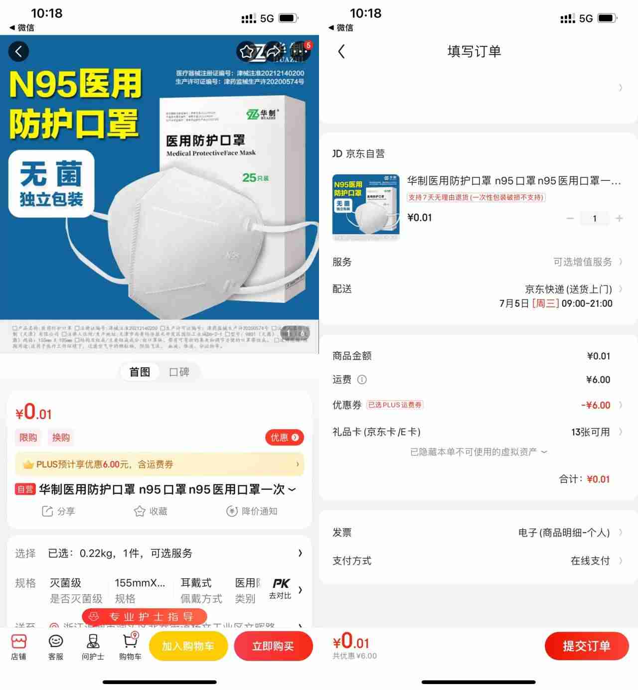 京东PLUS 0.01撸25个N95口罩