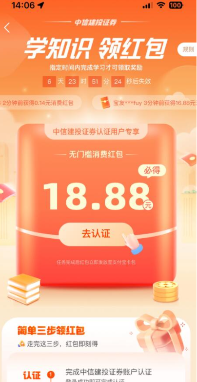 支付宝理财 认证领18.88元