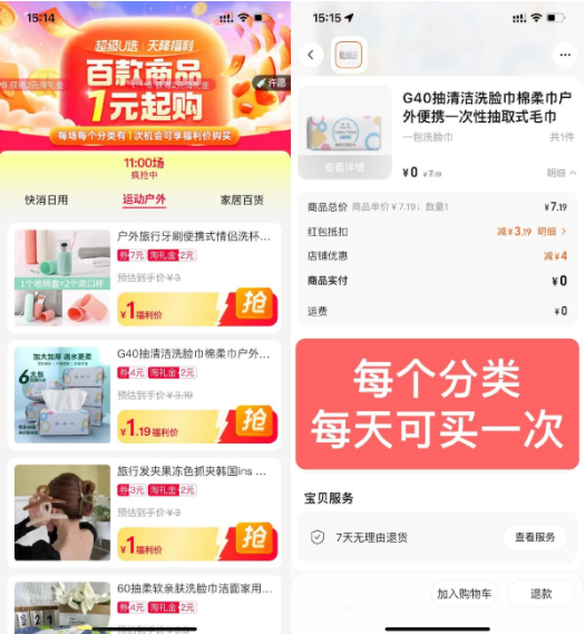 淘宝天降福利1元撸实物包邮
