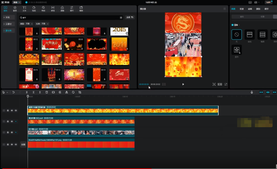 准备一些年尾的图片素材,导入视频切断一些片段,弄成下面那样子的就行了