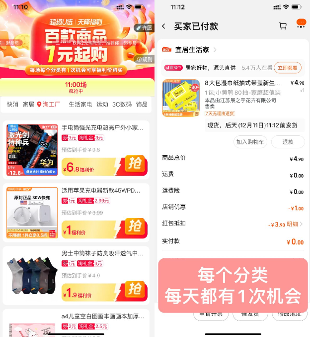 淘宝天降福利1元撸实物包邮