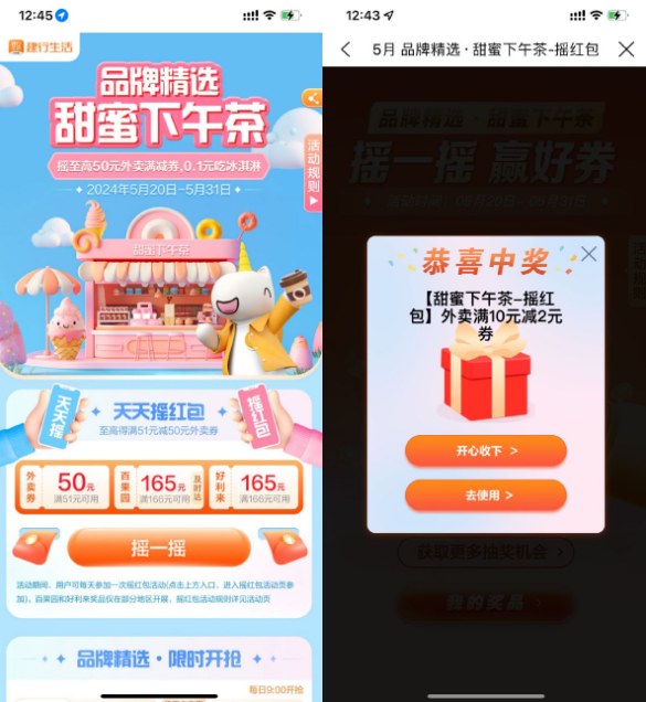 建行生活甜蜜下午茶抽外卖券